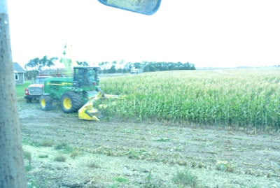 At the farm yesterday, the custom harvest crew showed up to chop corn for silage.  This is different than harvesting the corn with the combine.   We use the silage as part of the feed for the calves we will purchase here shortly for the winter.  The calves will then be sold around  April or May.