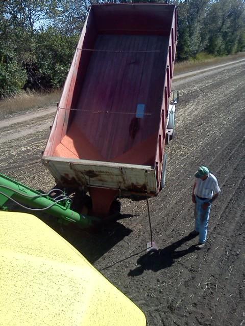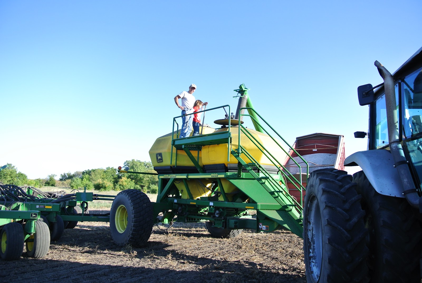 It’s a John Deere grain drill with air seeder. Milton uses it to plant wheat and soybeans. We purchased it in 2011 so he is still getting used to running it. It is quite different from the old grain drill the family used to use. Technology has come a long way in farming, and although we do not use GPS or autosteer in our tractors/combines at this point, I am sure in the future we will. This is our first big purchase in the 10 years I have been in the family.