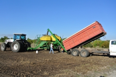 Then the auger carries it to the yellow tank on the air seeder drill.