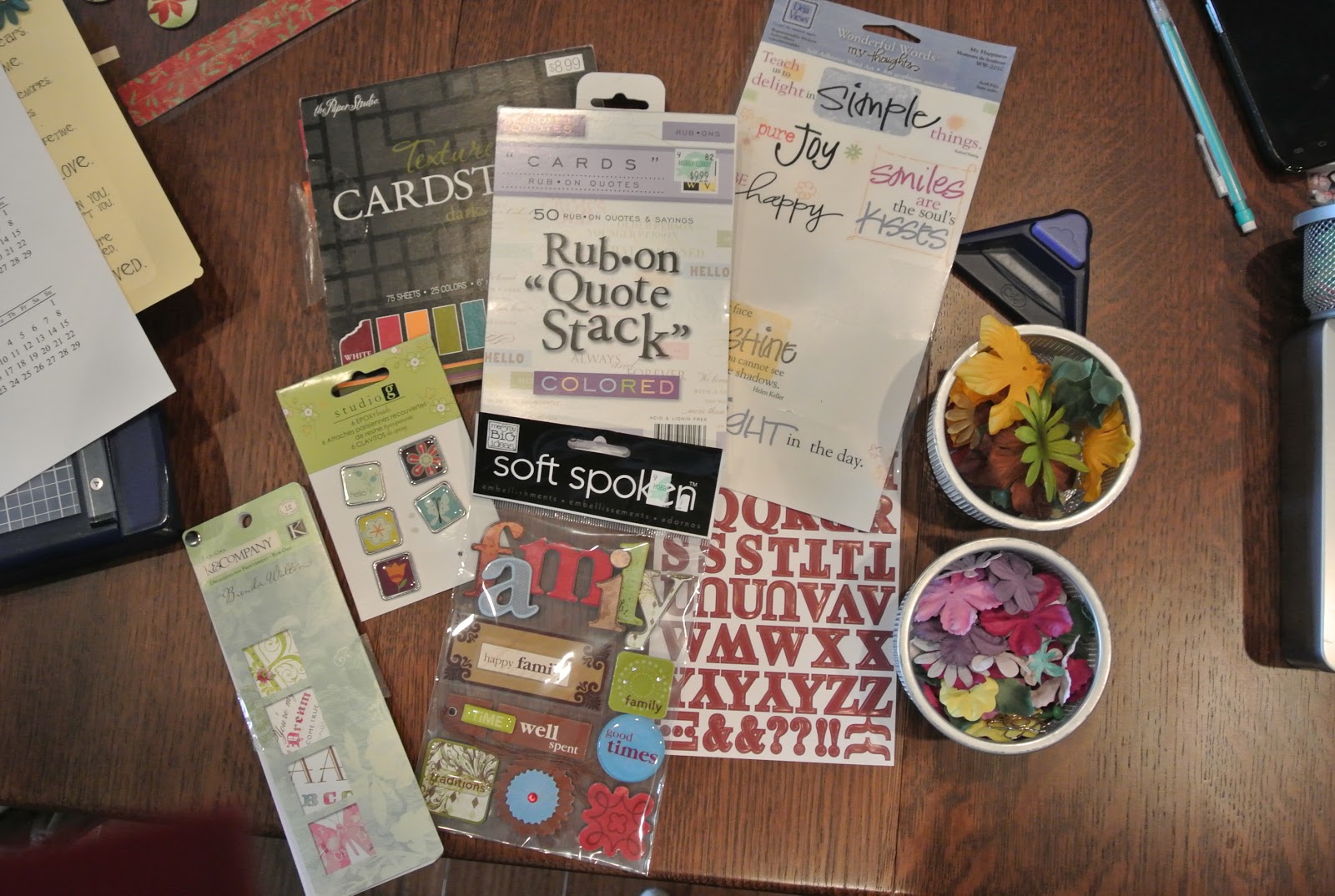 Then some scrapbook items such as cardstock, stickers, rub on letters, chipboard, flowers, etc.  Whatever your little heart desires!