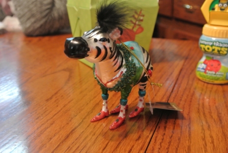 Each year the adults bring an ornament then we play the game where you can steal an ornament! Needless to say the snazzy zebra was not stolen! 🙂 My nephew ended up going home with her!