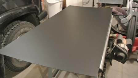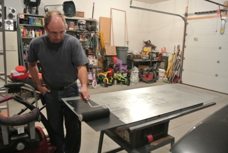 | Milton painting the sheet metal with chalk board paint. (please disregard the messy garage!) |