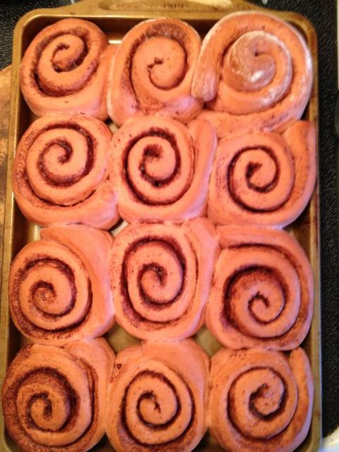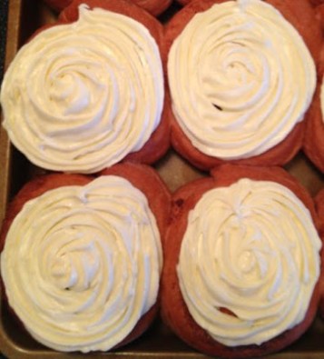 As rolls go, these are pretty easy and not too time consuming. I like to make 2 recipes of the dough and a double recipe of the cream cheese icing. I have found that staggering the dough recipes works out great. (I always seem to have problems with the final dough if I try to double a dough recipe.) It takes about 30 minutes to whip up the dough and that 30 minute separation between the two batches works great for the rest of the process. OH! I almost forgot! As with all Red Velvet recipes, it calls for red food coloring. I have a child with all kinds of food allergies, and food coloring in general is considered taboo in some circles, so I don’t use the full 1/2 tablespoon the recipe calls for and I usually make a recipe without any at all even though they aren’t as visually pleasing as the red ones.