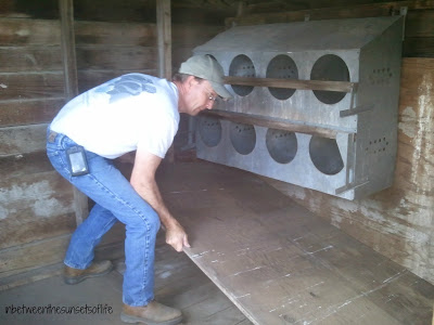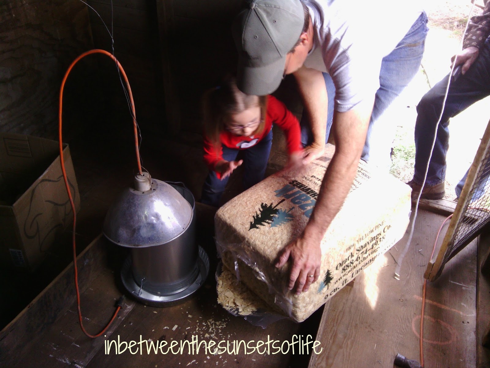 Milton built a little “pen” for them to stay in for now. Here they are putting some bedding and then the chicks in!