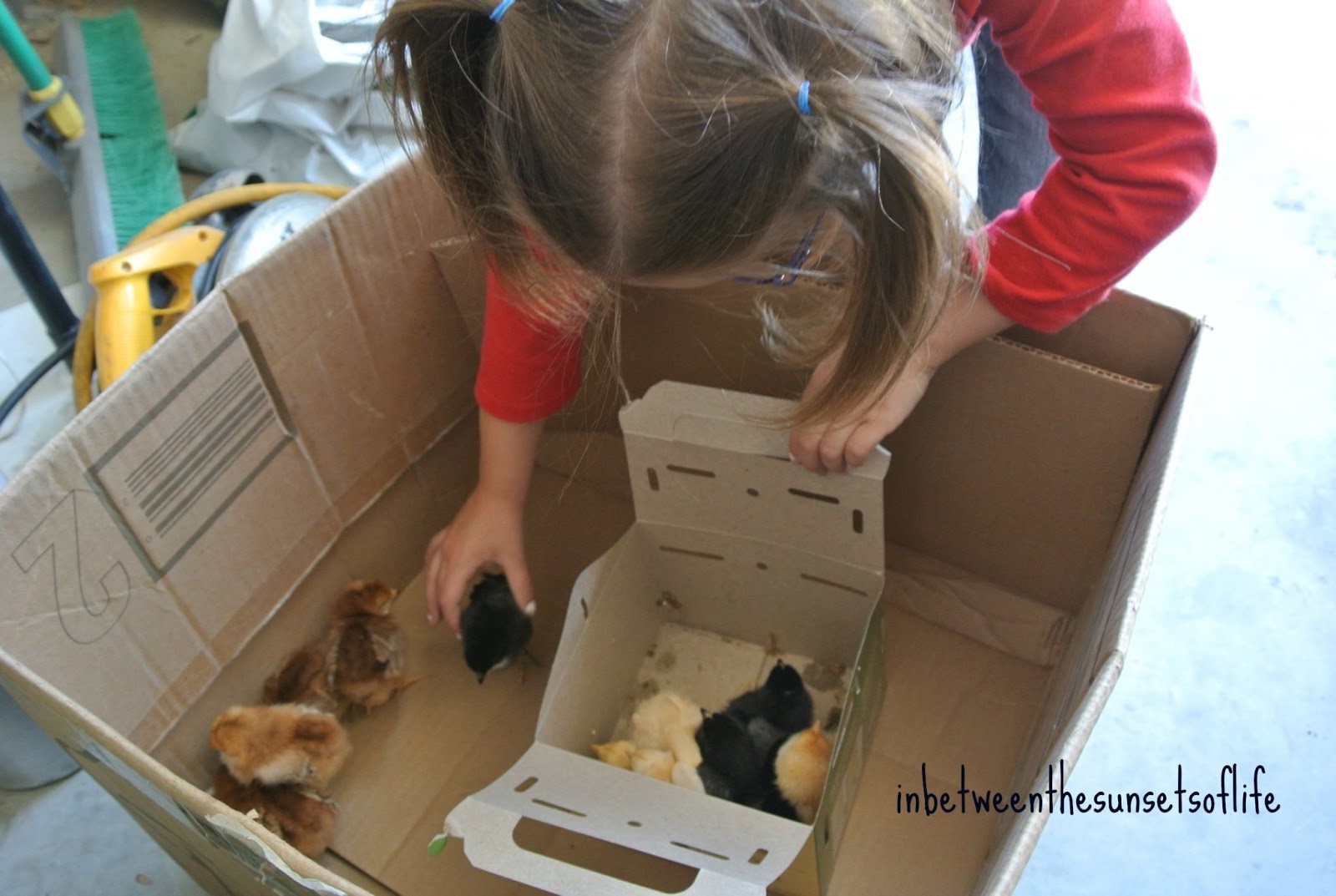 When we arrived home, we still had alittle work to do before the chicks could settle into their new home. So PV unloaded them into a bigger box so they could catch some sunrays.