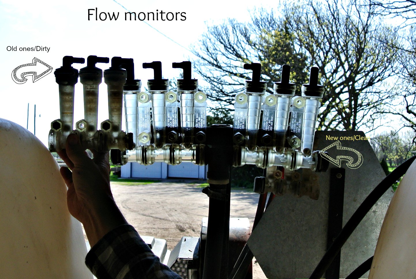 Flow Monitors: They are on the equipment to enable the Farmer to see if you have a plugged line or not.
