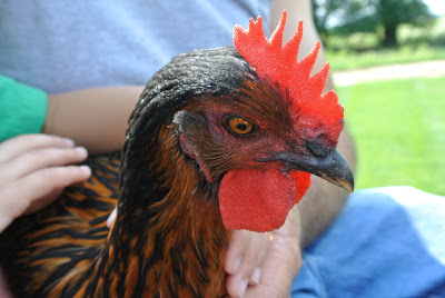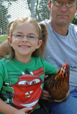 Her and her father had decided to take the tamest chicken we have for a ride!