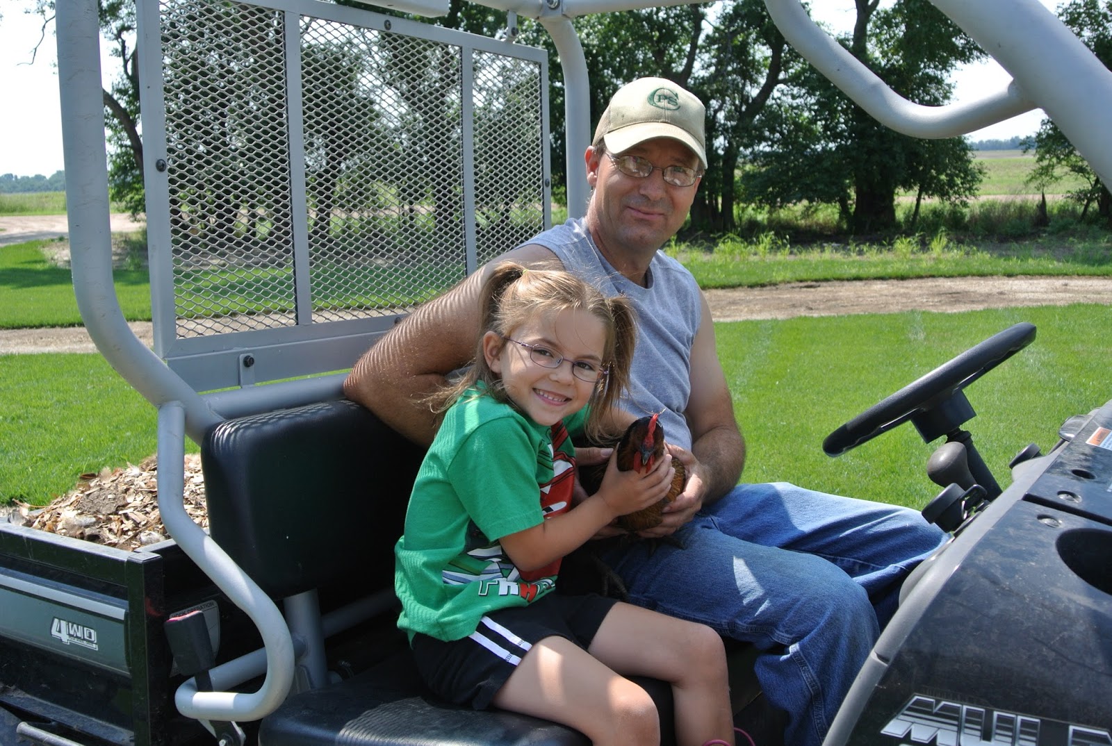 Her and her father had decided to take the tamest chicken we have for a ride!