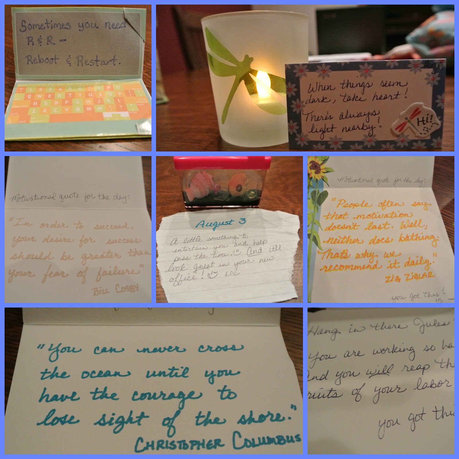 It has 31 items in all. One for each day of the month of August. Something to open each day to encourage me, make me laugh, or to stop worrying about what lies ahead. This is a prize that I will treasure forever. Handwritten notes are the best, and she has supplied me with many! 🙂
