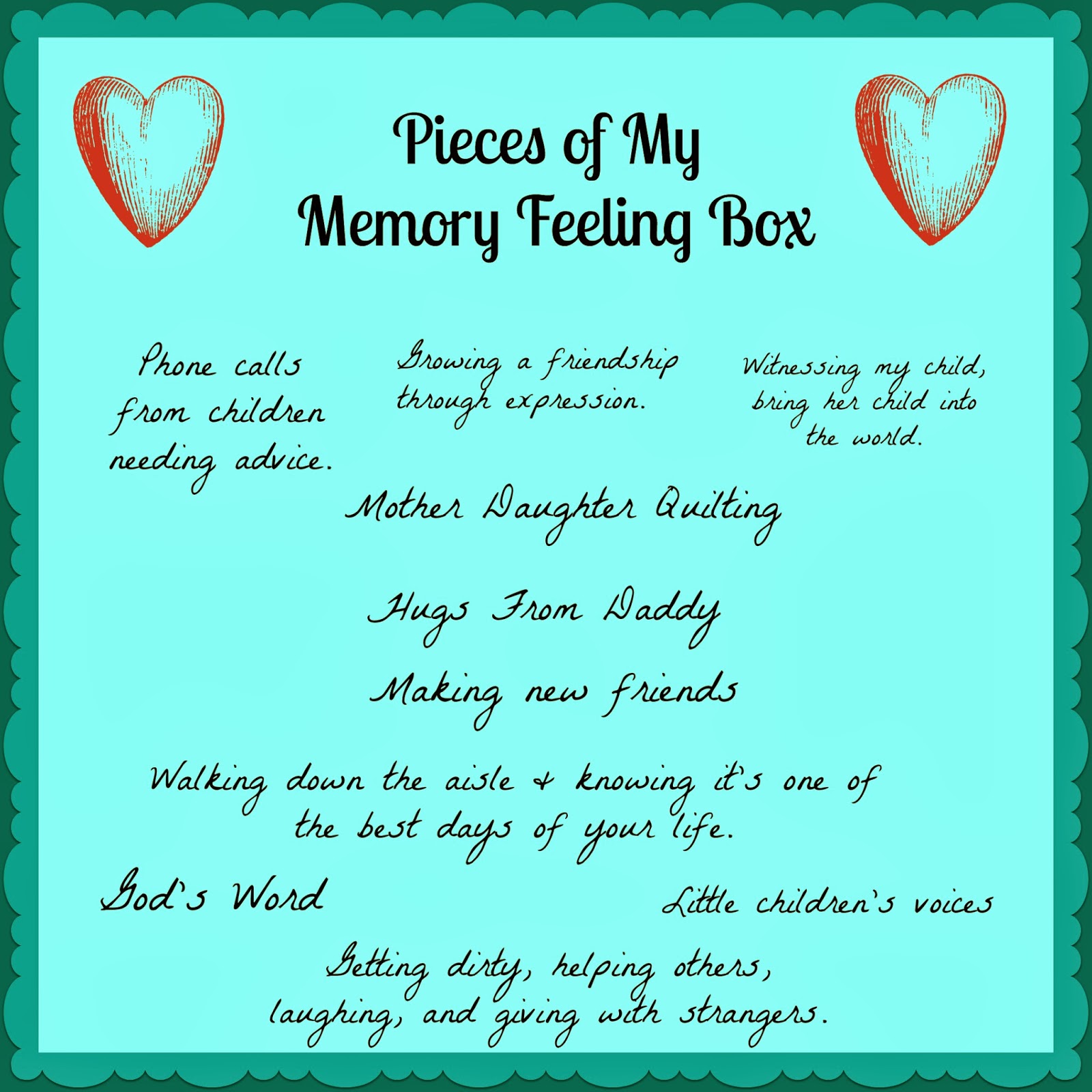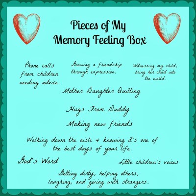 I could share more, but right now, I’m challenging you to open your memory feeling box. Take out a couple memories that fill your heart with warmth,