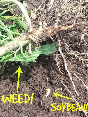 At one point, I pulled a weed and it had a large root on it and it had been right next to a Soybean.
