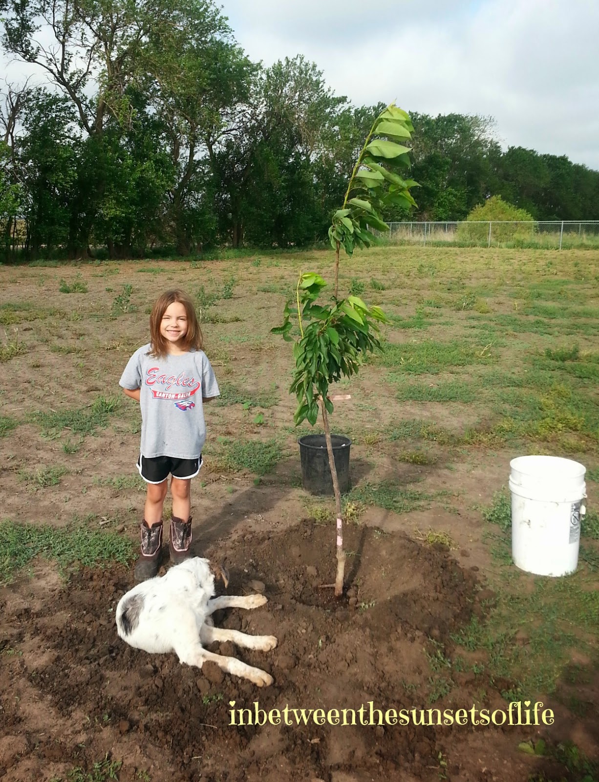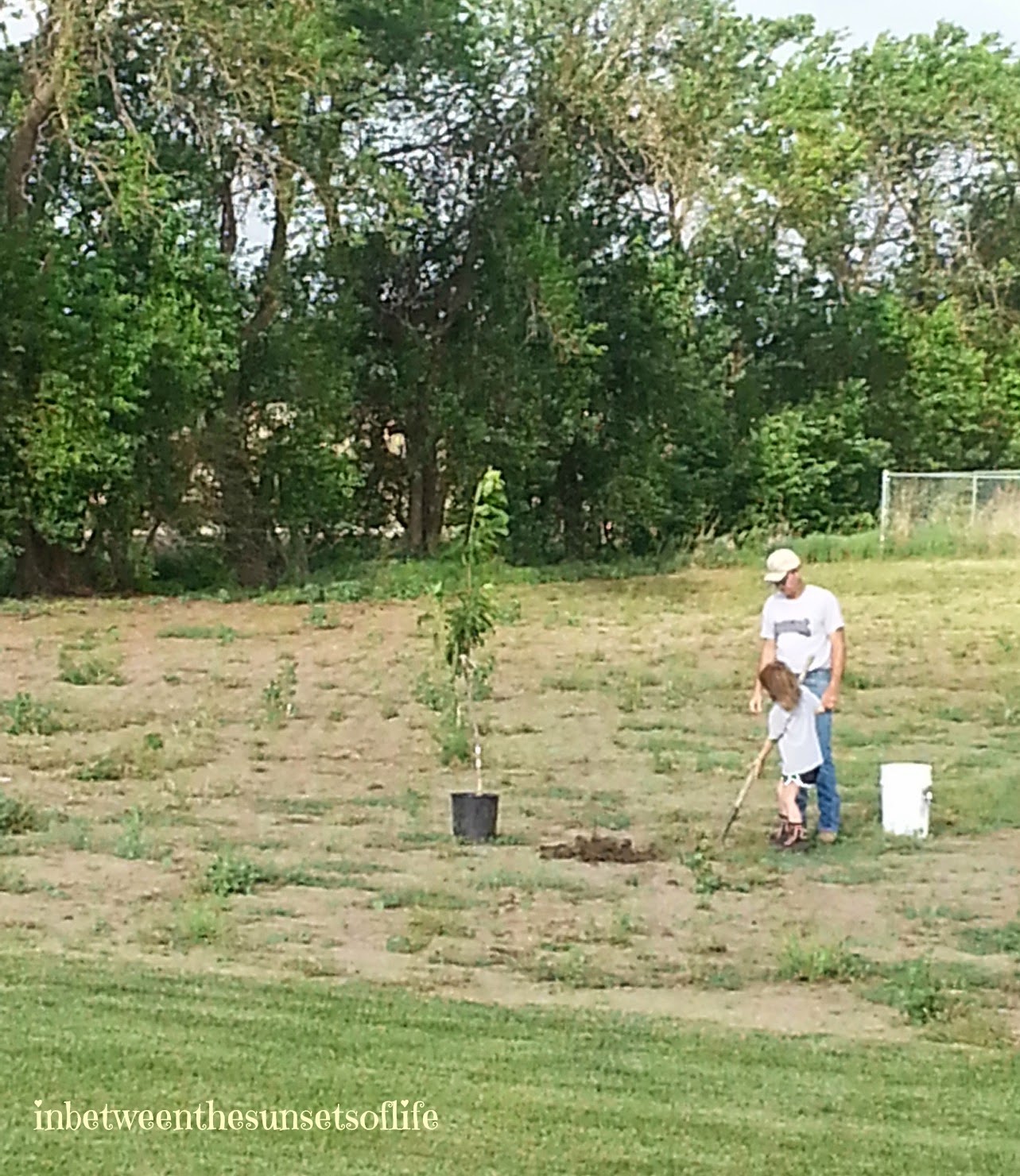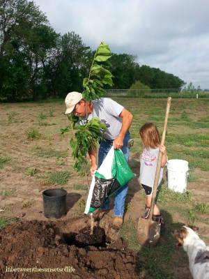 We have had two trees and a lilac bush to plant for a week, so Milton headed out to plant the cherry tree before church. We have a few fruit trees and this year we are excited because the peach tree has fruit on it!