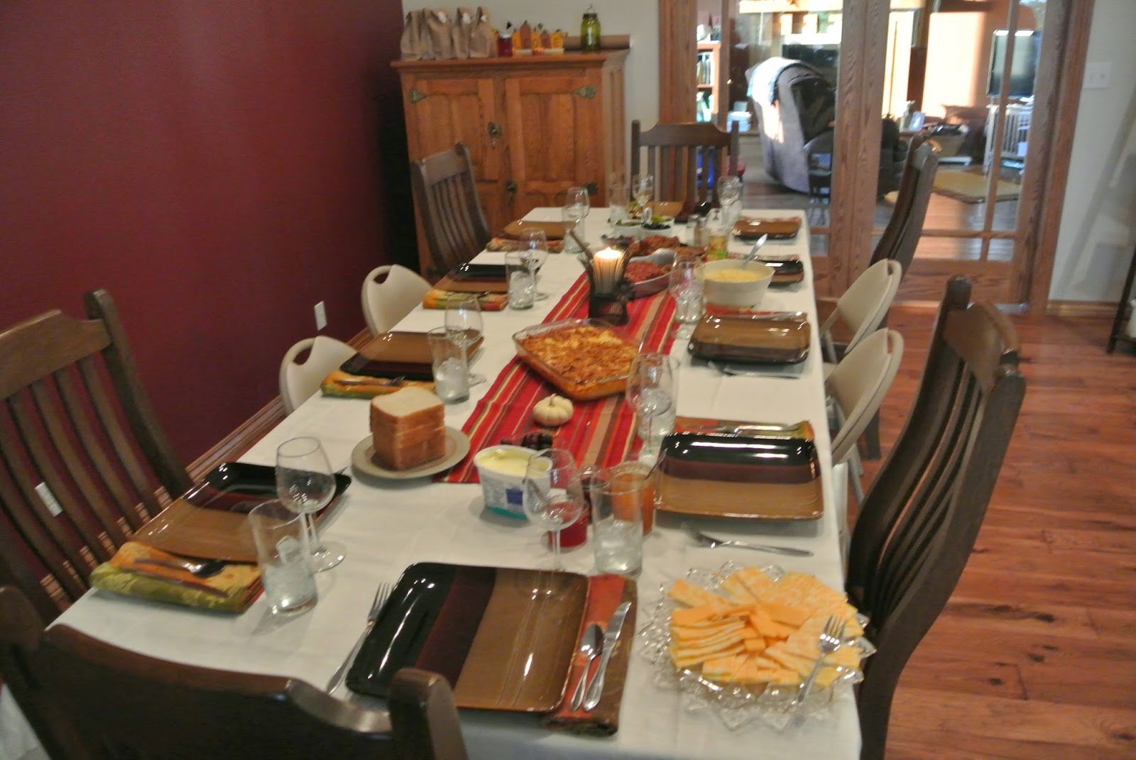 This year I chose a good home-cooked meal that is one of my husband’s favorite meat dishes. Although it was from an inexpensive cut of meat, we love this meatloaf recipe! To go with it we had potato casserole, crock pot corn, and a pumpkin dessert. I didn’t get around to making the homemade bread I wanted to, but I think it went just fine using Sara Lee honey wheat bread! We had three types of homemade jam to go with it!