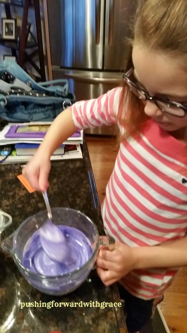 We took some of the batter and made it purple. PV really liked this part of the cake making process!