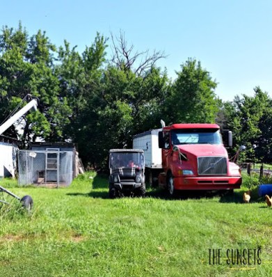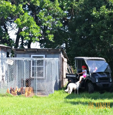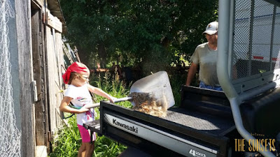 We have started letting them out midday and they do enjoy it! The cleaning of the chicken coop was long overdue. Time got away from us. They gathered the items needed. The mule, a couple shovels, and straw.