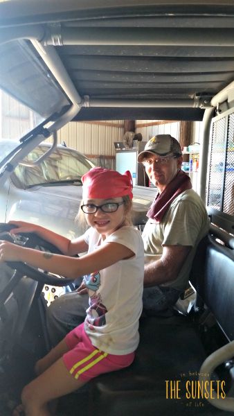 The concaves are parts of the combine. Don’t let them fool you, they are heavy, so he called on his trusty farm wife to come help him! He is holding one of them in this photo.