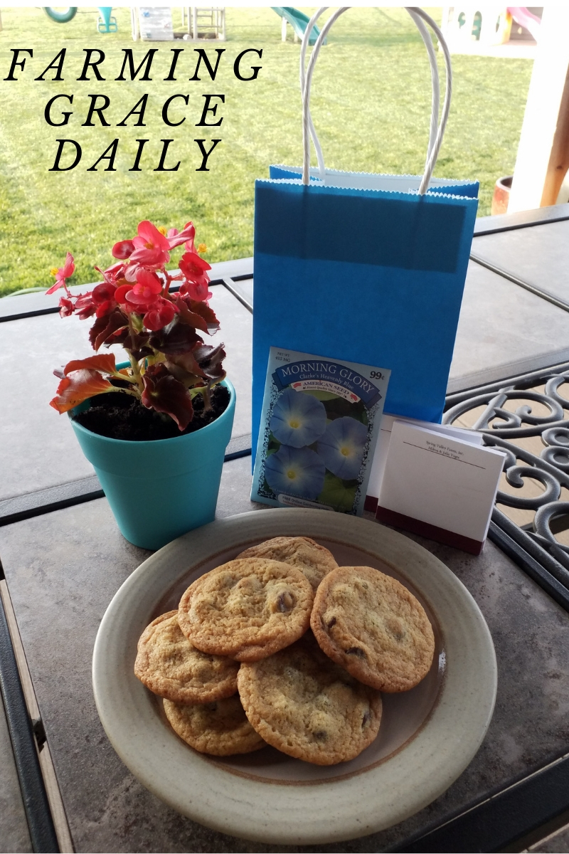 The party favors ran the simplicity and homemade theme, with our daughter helping out! She baked up some of her delish chocolate chip cookies to join the posty notes with our farm name on them, a packet of seeds and then everyone got to pick a potted flower to take with them!