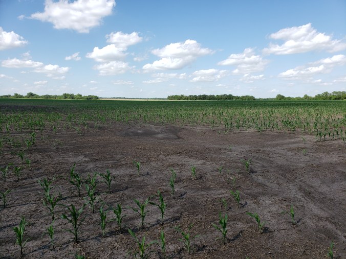 This is an example of where corn replant should occur. The issue is getting to the this area without damaging the other corn that is already coming up while replanting.