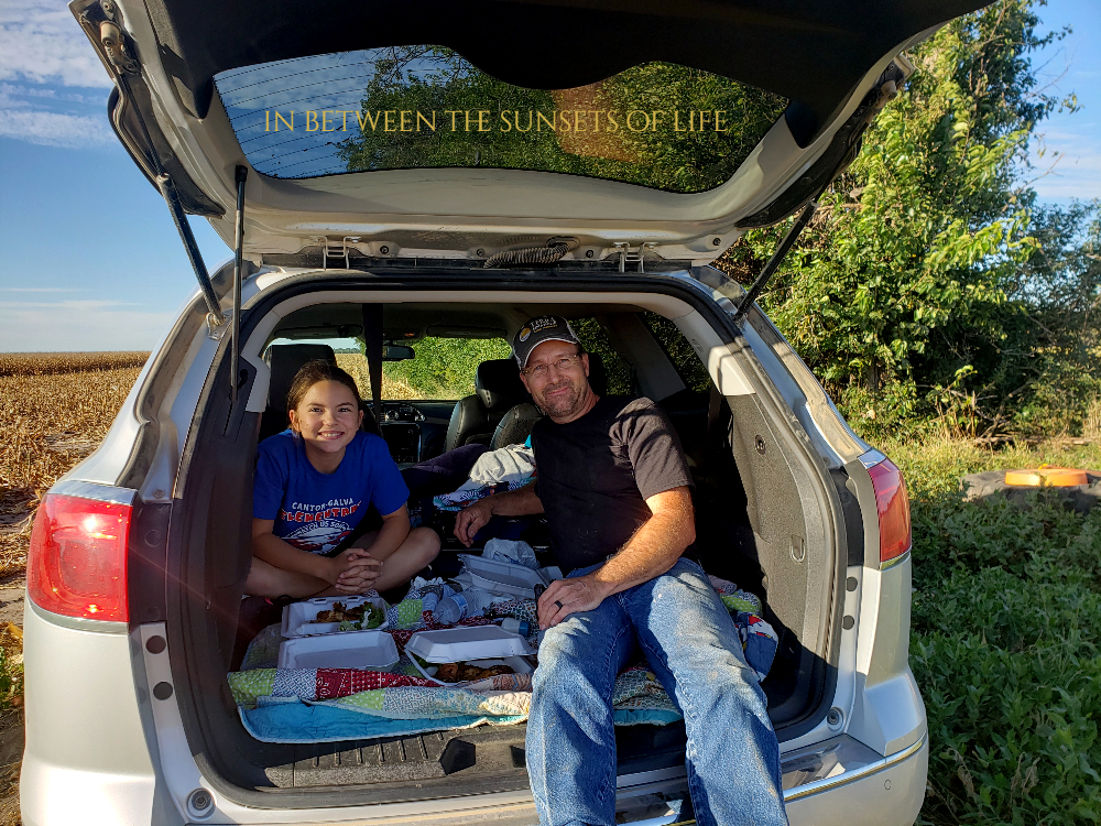 Sometimes the meals were served at the field so the farm kid could see her dad for a few minutes. It was fun on this night to have dinner out the back of our vehicle. The breeze was nice and just enjoyable all around! We had baked chicken legs, green bean bacon bundles and stuffed mushrooms. Not all our meals are fancy like this but I was off that day and it was all made in the oven so no big deal!