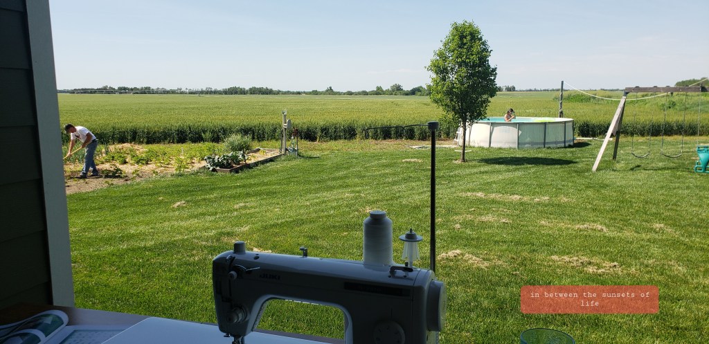 Our daughter enjoying swimming, I wanted to sew but also enjoy the beautiful weather, be near my family and my husband found his way to the garden. Now, to be honest I would not say that gardening is his favorite thing but he does enjoy physically working at least a tad even on Sunday. It’s just how he is wired.