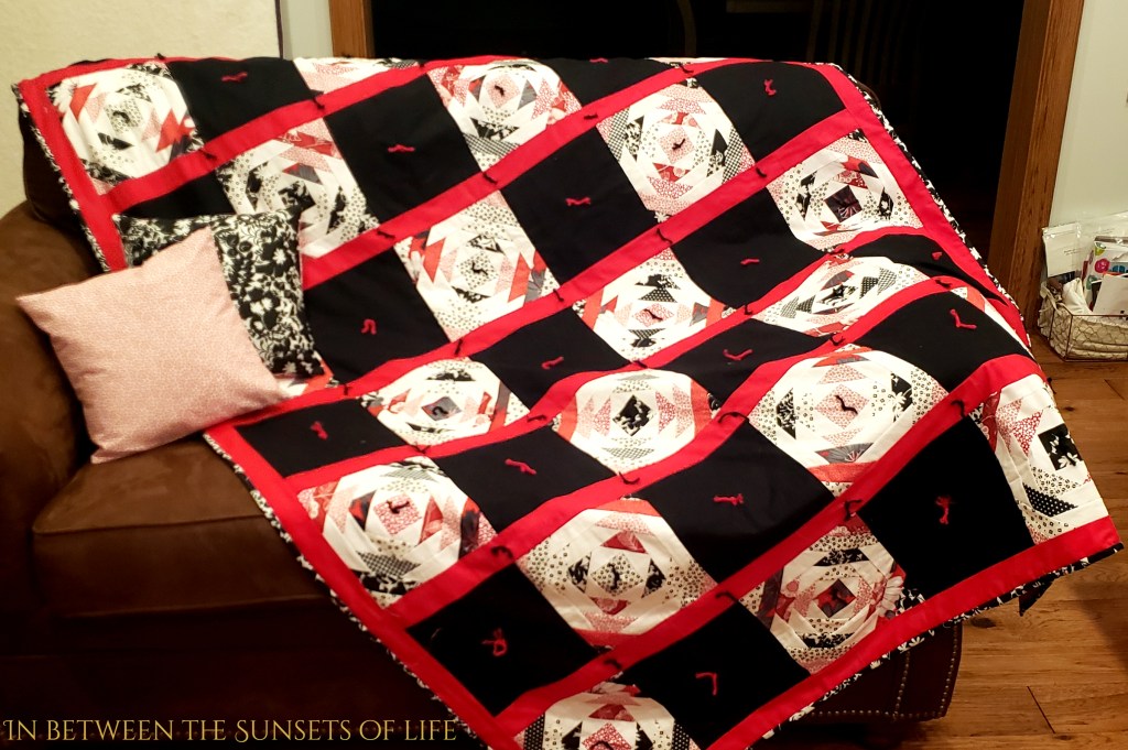 The first giveway was in February to celebrate Valentine’s Day and I had the perfect quilt to share! It was bold with red, black and white! I had never made this pattern before except for a single block. It was time consuming but also a good way to practice my skills. It is called the pineapple pattern and I just used up scraps from my fabric stash.