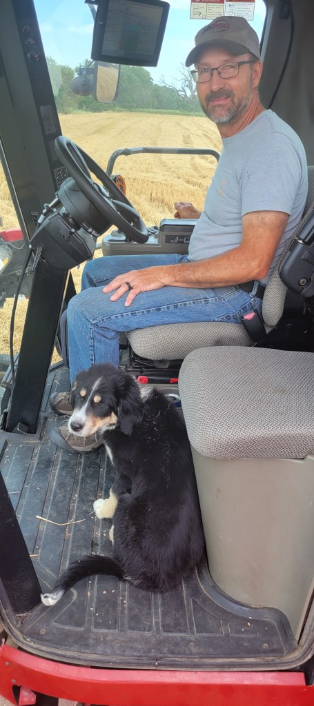 Our new puppy even made it into the combine! She had followed our old dog Charlie to the last fields by the farm and so Milton put her in the combine with him. Charlie always likes to run with the combine although he isn’t as fast as he used to be!